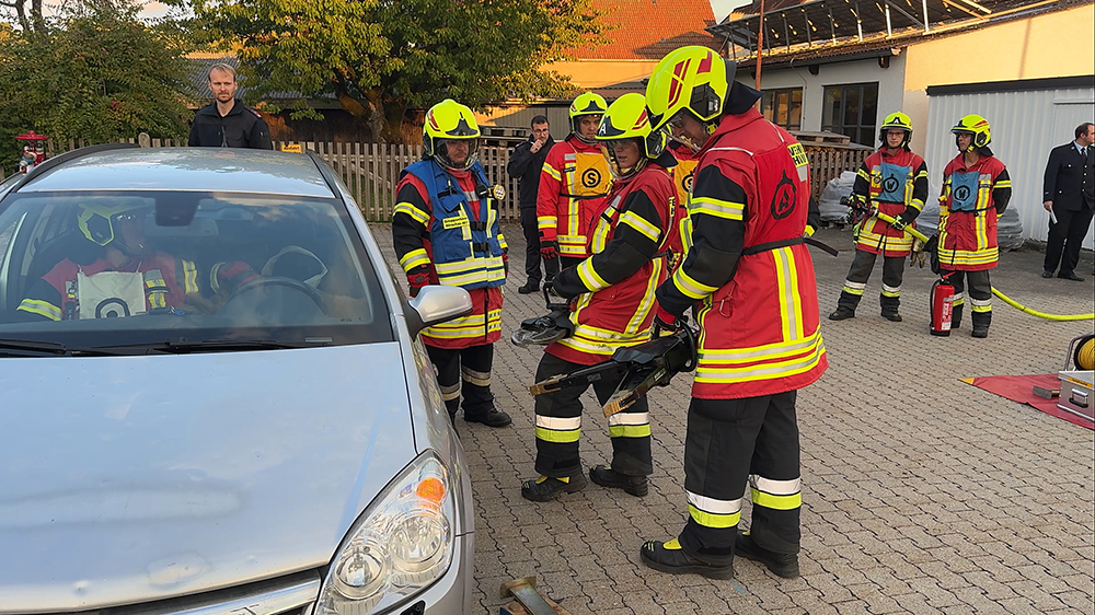 Fahrzeugbesatzung hydraulische Rettungsgeräte an die „Unfallstelle“ gebracht und die eingeklemmte